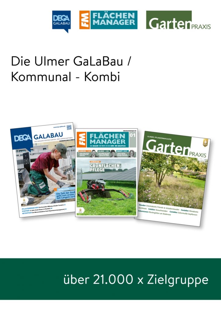 Mit der Ulmer GaLaBau-Kommunal-Kombi erreichen Sie eine breite Abdeckung in Ihren Zielgruppen. Mit einer Buchung belegen Sie gleich drei anerkannte Fachmagazine mit einer Auflage von insg. über 21.000 Exemplaren (garantiert IVW-geprüft):